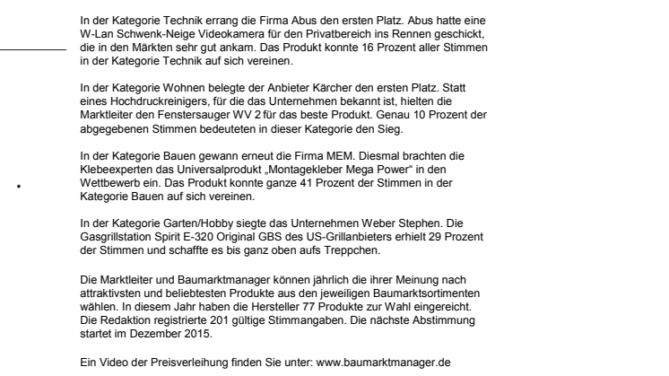 Die Marktleiter und Baumarktmanager können jährlich die ihrer Meinung nach attraktivsten und beliebtesten Produkte aus den jeweiligen Baumarktsortimenten wählen. In diesem Jahr haben die Hersteller 77 Produkte zur Wahl eingereicht. Die Redaktion registrierte 201 gültige Stimmangaben. Die nächste Abstimmung startet im Dezember 2015.