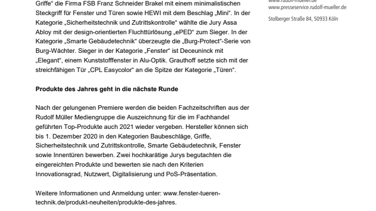 Nach der gelungenen Premiere werden die beiden Fachzeitschriften aus der Rudolf Müller Mediengruppe die Auszeichnung für die im Fachhandel geführten Top-Produkte auch 2021 wieder vergeben. Hersteller können sich bis zum 1. Dezember 2020 in den Kategorien Baubeschläge, Griffe, Sicherheitstechnik und Zutrittskontrolle, Smarte Gebäudetechnik, Fenster sowie Innentüren bewerben. Zwei hochkarätige Jurys begutachten die eingereichten Produkte und bewerten sie nach den Kriterien Innovationsgrad, Nutzwert, Digitalisierung und PoS-Präsentation.