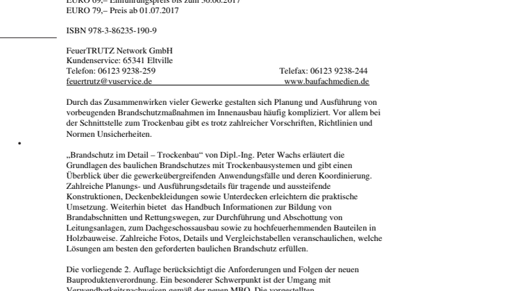 „Brandschutz im Detail – Trockenbau“ von Dipl.-Ing. Peter Wachs erläutert die Grundlagen des baulichen Brandschutzes mit Trockenbausystemen und gibt einen Überblick über die gewerkeübergreifenden Anwendungsfälle und deren Koordinierung. Zahlreiche Planungs- und Ausführungsdetails für tragende und aussteifende Konstruktionen, Deckenbekleidungen sowie Unterdecken erleichtern die praktische Umsetzung. Weiterhin bietet das Handbuch Informationen zur Bildung von Brandabschnitten und Rettungswegen, zur Durchführung und Abschottung von Leitungsanlagen, zum Dachgeschossausbau sowie zu hochfeuerhemmenden Bauteilen in Holzbauweise. Zahlreiche Fotos, Details und Vergleichstabellen veranschaulichen, welche Lösungen am besten den geforderten baulichen Brandschutz erfüllen.