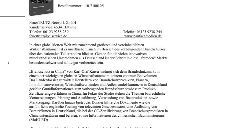 „Brandschutz in China“ von Karl-Olaf Kaiser widmet sich dem Brandschutzmarkt in einem der wichtigsten globalen Wirtschaftsräume mit einem enormen Bauvolumen. Das Länderdossier vermittelt Herstellern von Brandschutzprodukten, Planern, Immobilieninvestoren, Wirtschaftsverbänden und Außenhandelskammern in Deutschland gezielte Grundinformationen zum vorbeugenden Brandschutz sowie zum Produkt-Zertifizierungsverfahren in China. Im Fokus der Studie stehen die Themen baurechtliche Voraussetzungen, Planung und Ausführung, Verwendung von Bauproduktensowie Marktzugang. Darüber hinaus bietet das Dossier hilfreiche Dokumente wie die ausführliche englische Fassung von relevanten Gesetzestexten, eine Auflistung von Beraterfirmen in Deutschland, die bei der CC-Zertifizierung von Brandschutzprodukten in China unterstützen und beraten, sowie Informationen des chinesischen Bauministeriums (MoHURD).