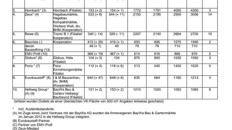 (A) Im Zuge eines Joint Ventrues mit der BayWa AG wurden die firmeneigenen BayWa Bau & Gartenmärkte im Januar 2012 in die Hellweg Group integriert.