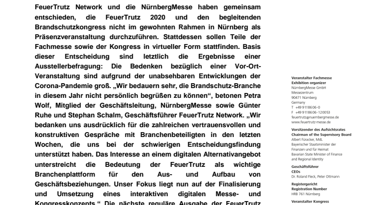 Köln/Nürnberg, 15. Juli 2020 - FeuerTrutz Network und die NürnbergMesse haben gemeinsam entschieden, die FeuerTrutz 2020 und den begleitenden Brandschutzkongress nicht im gewohnten Rahmen in Nürnberg als Präsenzveranstaltung durchzuführen. Stattdessen sollen Teile der Fachmesse sowie der Kongress in virtueller Form stattfinden. Basis dieser Entscheidung sind letztlich die Ergebnisse einer Ausstellerbefragung: Die Bedenken bezüglich einer Vor-Ort-Veranstaltung sind aufgrund der unabsehbaren Entwicklungen der Corona-Pandemie groß. „Wir bedauern sehr, die Brandschutz-Branche in diesem Jahr nicht persönlich begrüßen zu können“, betonen Petra Wolf, Mitglied der Geschäftsleitung, NürnbergMesse sowie Günter Ruhe und Stephan Schalm, Geschäftsführer FeuerTrutz Network. „Wir bedanken uns ausdrücklich für die zahlreichen vertrauensvollen und konstruktiven Gespräche mit Branchenbeteiligten in den letzten Wochen, die uns bei der schwierigen Entscheidungsfindung unterstützt haben. Das Interesse an einem digitalen Alternativangebot unterstreicht die Bedeutung der FeuerTrutz als wichtige Branchenplattform für den Aus- und Aufbau von Geschäftsbeziehungen. Unser Fokus liegt nun auf der Finalisierung und Umsetzung eines interaktiven digitalen Messe- und Kongresskonzepts.“ Die nächste reguläre Ausgabe der FeuerTrutz findet am 23. und 24. Juni 2021 im Messezentrum Nürnberg statt.