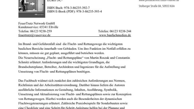 Im Brand- und Gefahrenfall sinddie Flucht- und Rettungswege die wichtigsten baulichen Bereiche innerhalb von Gebäuden. Um ihre Funktion im Notfall erfüllen zu können, müssen sie gut geplant, ausgeführt und betrieben werden. Die Neuerscheinung „Flucht- und Rettungspläne“ von Martin Roszak und Constantin Schmitz erläutert Anforderungen und die wichtigsten Grundlagen, die Brandschutzplaner, Betreiber, Architekten und Ingenieure für die Aufstellung und Umsetzung von Flucht- und Rettungsplänen benötigen.