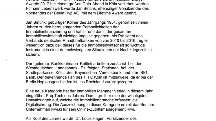 immobilienmanager Award 2017: Der gebürtige Kölner Jan Bettink, Berlin Hyp, erhält den Lifetime Award / Erstmals PropTech-Unternehmen ausgezeichnet / Zwölf weitere Preise vergeben.