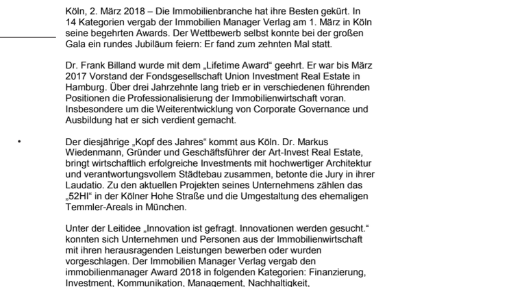 immobilienmanager Award 2018: 14 Preise vergeben, unter anderem an Dr. Frank Billand für sein Lebenswerk und an Dr. Markus Wiedenmann als „Kopf des Jahres“.