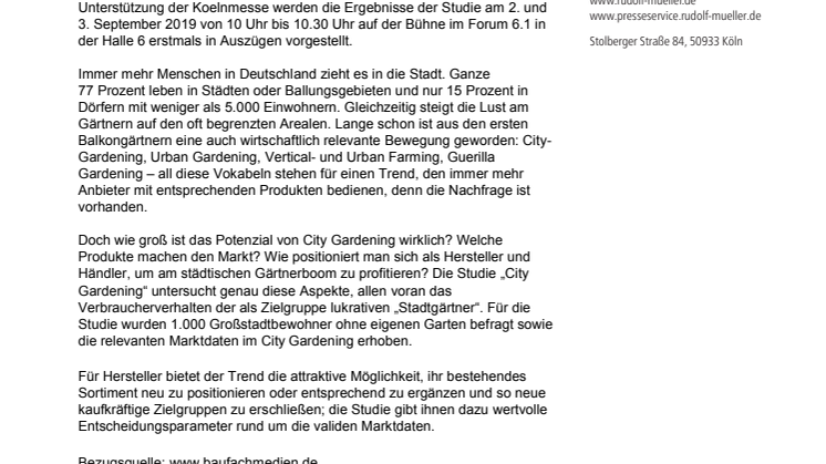 Köln, 15. August 2019 – Zum Start der weltweit größten Gartenmesse spoga+gafa 2019 präsentieren die Fachmedienmarken BaumarktManager und Markt in Grün aus der Kölner Rudolf Müller Mediengruppe die neue Marktforschungsstudie City Gardening – Gärtnern ohne Garten. Die Studie beleuchtet das Potenzial von City Gardening und gibt schlüssige Antworten auf Kernfragen wie Einkaufsstätten, Zielgruppe und Sortimente. Mit Unterstützung der Koelnmesse werden die Ergebnisse der Studie am 2. und 3. September 2019 von 10 Uhr bis 10.30 Uhr auf der Bühne im Forum 6.1 in der Halle 6 erstmals in Auszügen vorgestellt.