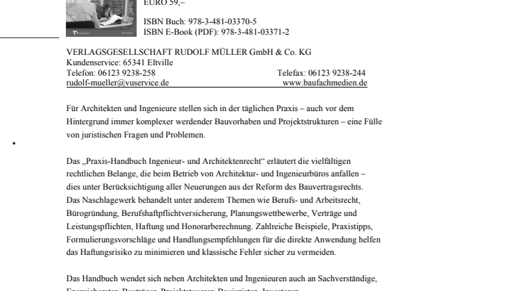 Das „Praxis-Handbuch Ingenieur- und Architektenrecht“ erläutert die vielfältigen rechtlichen Belange, die beim Betrieb von Architektur- und Ingenieurbüros anfallen – dies unter Berücksichtigung aller Neuerungen aus der Reform des Bauvertragsrechts. Das Naschlagewerk behandelt unter anderem Themen wie Berufs- und Arbeitsrecht, Bürogründung, Berufshaftpflichtversicherung, Planungswettbewerbe, Verträge und Leistungspflichten, Haftung und Honorarberechnung.Zahlreiche Beispiele, Praxistipps, Formulierungsvorschläge und Handlungsempfehlungen für die direkte Anwendung helfen das Haftungsrisiko zu minimieren und klassische Fehler sicher zu vermeiden.