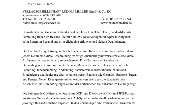 Besonders beim Bauen im Bestand steckt der Teufel im Detail. Die „Standard-Detail-Sammlung Bauen im Bestand“ liefert rund 250 Detailvorlagen für typische Aufgaben beim Bauen im Bestand und ermöglicht eine effiziente und sichere Detailplanung.