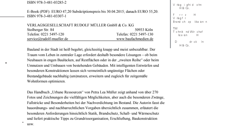 Das Handbuch „Urbane Ressourcen“ von Petra Lea Müller zeigt anhand von über 270 Fotos und Zeichnungen die vielfältigen Möglichkeiten, aber auch die besonderen Zwänge, Fallstricke und Besonderheiten bei der Nachverdichtung im Bestand. Die Autorin fasst die bauordnungs- und nachbarrechtlichen Vorgaben übersichtlich zusammen, erläutert die