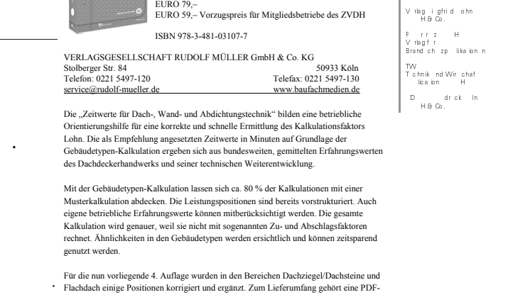 Für die nun vorliegende 4. Auflage wurden in den Bereichen Dachziegel/Dachsteine und Flachdach einige Positionen korrigiert und ergänzt. Zum Lieferumfang gehört eine PDF-Downloaddatei, die es ermöglicht, sämtliche Positionen und Werte in Excel auszulagern und dort dann weiter zu bearbeiten. Eine komfortable Suchfunktion hilft darüber hinaus, einzelne Leistungspositionen und deren Zeitwerte schnell und gezielt zu finden.