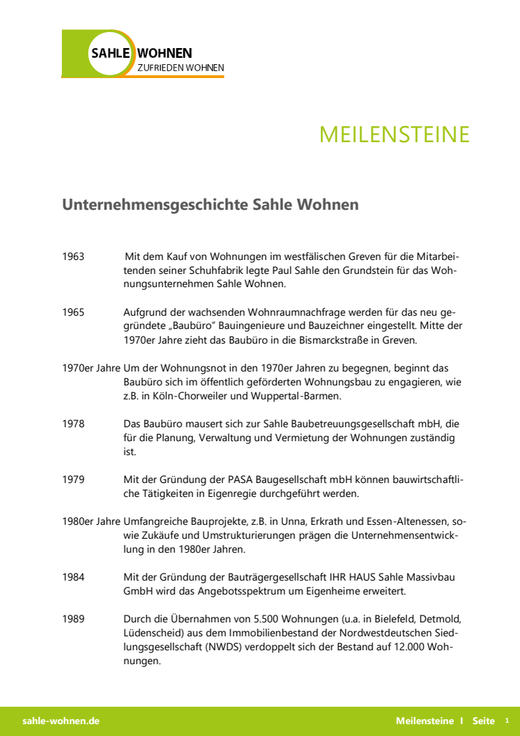 Meilensteine in der Unternehmensgeschichte von Sahle Wohnen