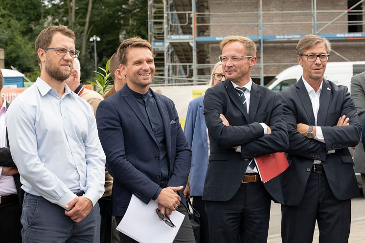 Staatssekretär Daniel Sieveke (2.v.r.) mit den Vertretern der beiden Bauherren des Gemeinschaftsprojekts Pandion Ville, Friederich Sahle (Geschäftsführer Sahle Wohnen GmbH & co.KG, 2.v.l.) und Thomas Brunken (Leiter Entwicklung Wohnen, Pandion Real Estate GmbH, 1.v.l.)