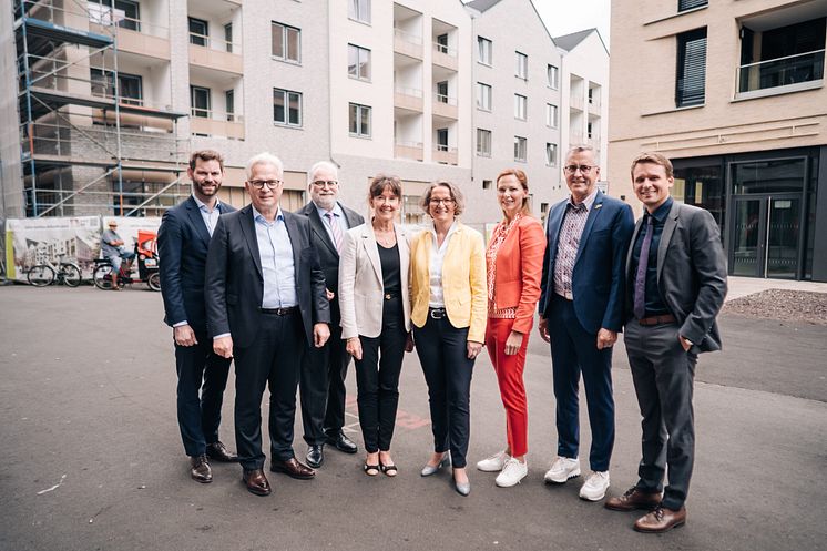 Im Rahmen der diesjährigen „WOHNENRW-Tage“ besuchte Ina Scharrenbach, Ministerin für Heimat, Kommunales, Bau und Digitalisierung des Landes Nordrhein-Westfalen, die Neue Mitte Porz. Gemeinsam mit den drei Bauherren des Projekts moderne stadt GmbH (Haus 1), Sahle Wohnen (Haus 2) und der Aacher Siedlungs- und Wohnungsgesellschaft (Haus 3) sowie Vertreter*innen der Allianz für mehr Wohnungsbau NRW und der Kirchengemeinde St. Josef wurde das Projekt für seinen Beitrag zum sozialen, geförderten Wohnungsbau in Köln gewürdigt. Die Teilnahme der Ministerin an einem Veedelsfest zum 60-jährigen Bestehen von Sahle Wohnen bildete den Abschluss ihres Besuchs.