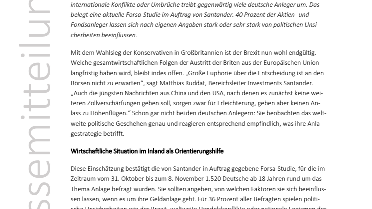 Mit dem Wahlsieg der Konservativen in Großbritannien ist der Brexit nun wohl endgültig. Welche gesamtwirtschaftlichen Folgen der Austritt der Briten aus der Europäischen Union langfristig haben wird, bleibt indes offen. „Große Euphorie über die Entscheidung ist an den Börsen nicht zu erwarten“, sagt Matthias Ruddat, Bereichsleiter Investments Santander. „Auch die jüngsten Nachrichten aus China und den USA, nach denen es zunächst keine weiteren Zollverschärfungen geben soll, sorgen zwar für Erleichterung, geben aber keinen Anlass zu Höhenflügen.“ Schon gar nicht bei den deutschen Anlegern: Sie beobachten das weltweite politische Geschehen genau und reagieren entsprechend empfindlich, was ihre Anlagestrategie betrifft.