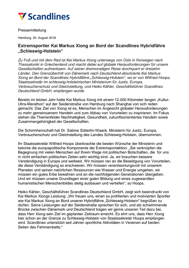 Extremsportler Kai Markus Xiong an Bord der Scandlines Hybridfähre „Schleswig-Holstein“