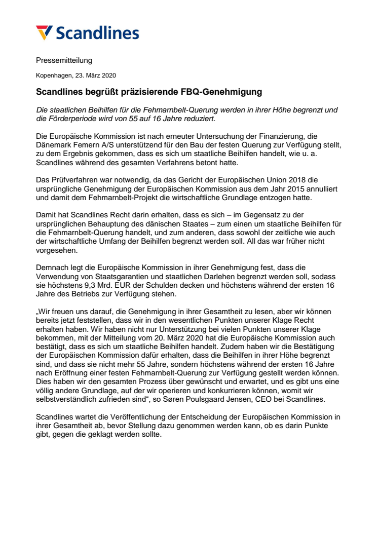 Scandlines begrüßt präzisierende FBQ-Genehmigung