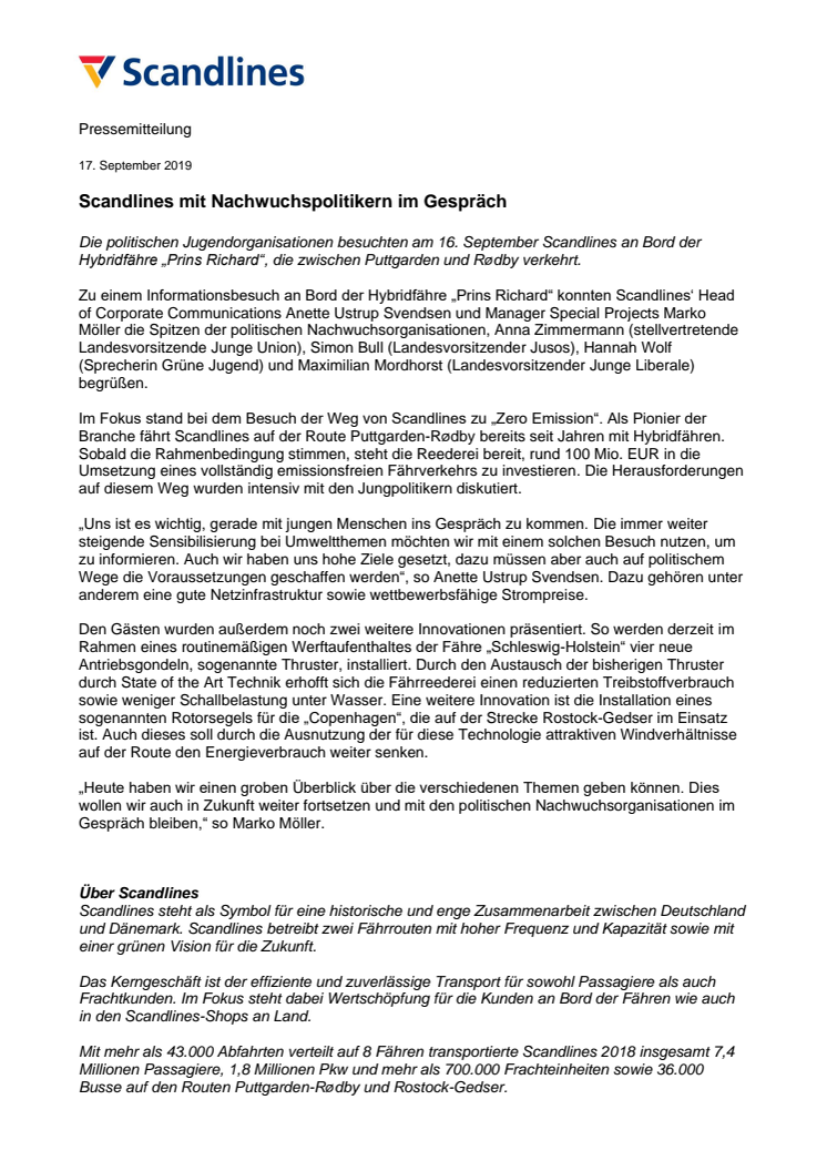 Die politischen Jugendorganisationen besuchten am 16. September Scandlines an Bord der Hybridfähre „Prins Richard“, die zwischen Puttgarden und Rødby verkehrt.