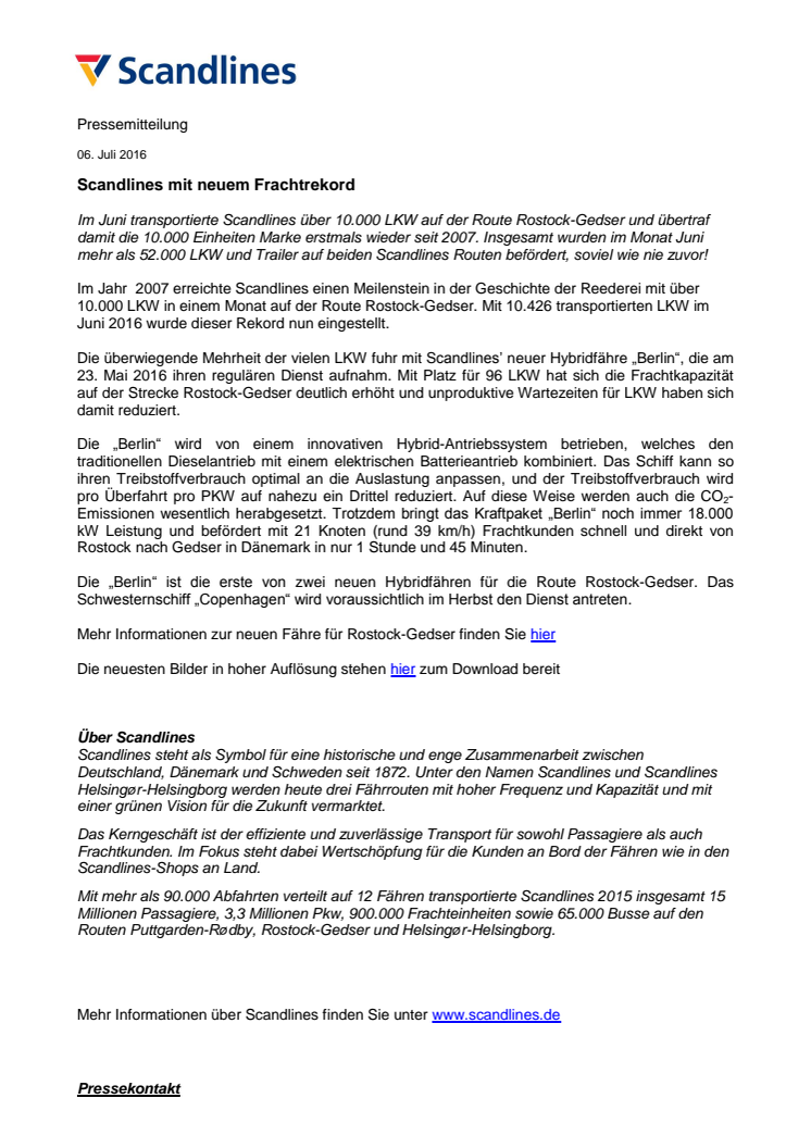 Im Juni transportierte Scandlines über 10.000 LKW auf der Route Rostock-Gedser und übertraf damit die 10.000 Einheiten Marke erstmals wieder seit 2007. Insgesamt wurden im Monat Juni mehr als 52.000 LKW und Trailer auf beiden Scandlines Routen befördert, soviel wie nie zuvor!