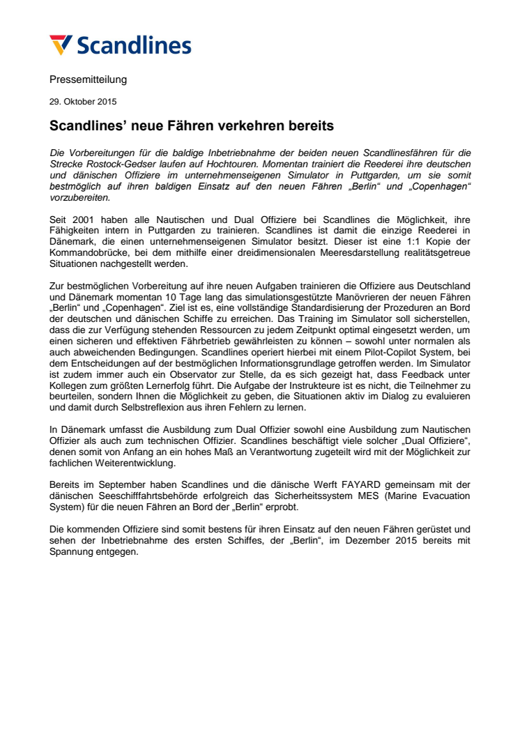 Die Vorbereitungen für die baldige Inbetriebnahme der beiden neuen Scandlinesfähren für die Strecke Rostock-Gedser laufen auf Hochtouren. Momentan trainiert die Reederei ihre deutschen und dänischen Offiziere im unternehmenseigenen Simulator in Puttgarden, um sie somit bestmöglich auf ihren baldigen Einsatz auf den neuen Fähren „Berlin“ und „Copenhagen“ vorzubereiten.