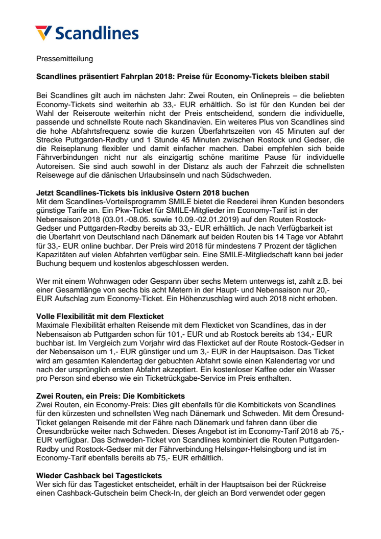 Scandlines präsentiert Fahrplan 2018: Preise für Economy-Tickets bleiben stabil