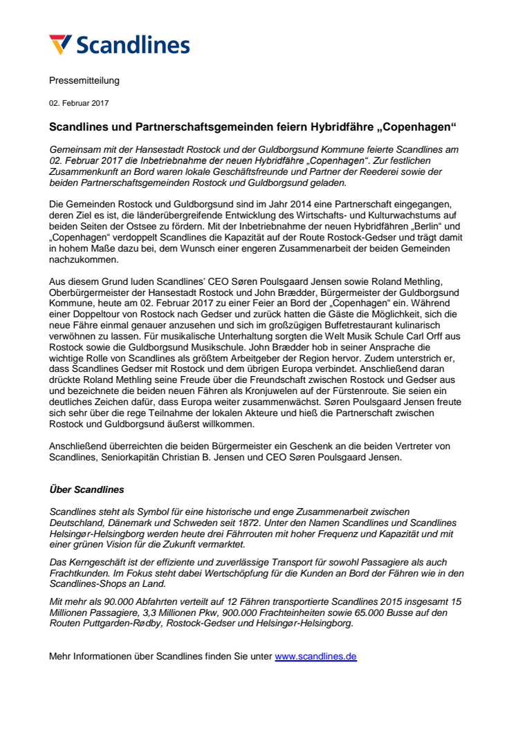 Gemeinsam mit der Hansestadt Rostock und der Guldborgsund Kommune feierte Scandlines am 02. Februar 2017 die Inbetriebnahme der neuen Hybridfähre „Copenhagen“. Zur festlichen Zusammenkunft an Bord waren lokale Geschäftsfreunde und Partner der Reederei sowie der beiden Partnerschaftsgemeinden Rostock und Guldborgsund geladen.