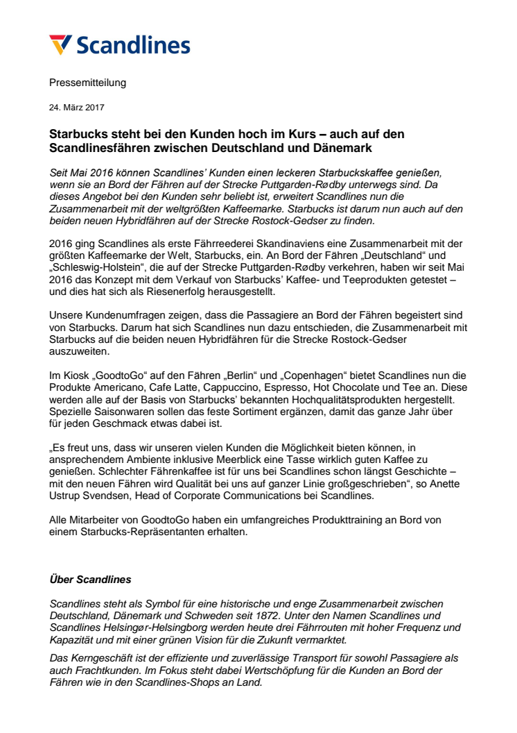 Seit Mai 2016 können Scandlines’ Kunden einen leckeren Starbuckskaffee genießen, wenn sie an Bord der Fähren auf der Strecke Puttgarden-Rødby unterwegs sind. Da dieses Angebot bei den Kunden sehr beliebt ist, erweitert Scandlines nun die Zusammenarbeit mit der weltgrößten Kaffeemarke. Starbucks ist darum nun auch auf den beiden neuen Hybridfähren auf der Strecke Rostock-Gedser zu finden.