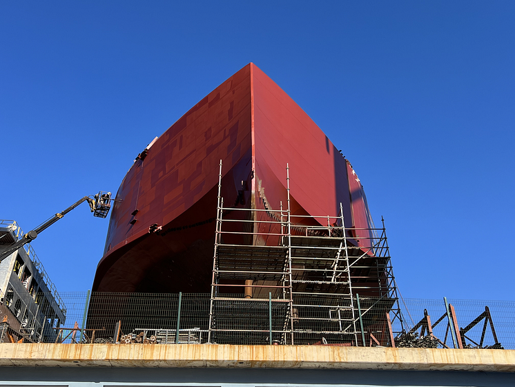 The hull of the Scandlines zero direct emissions ferry PR24 on the slipway - forward.