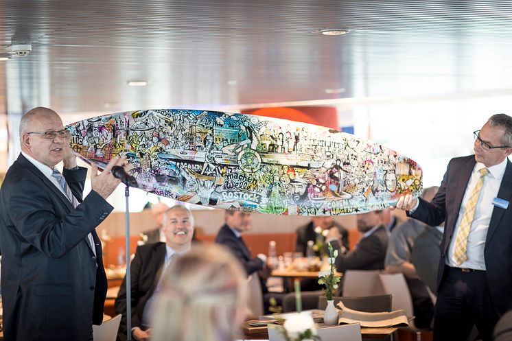 Roland Methling (Oberbürgermeister von Rostock) und John Brædder (Bürgermeister der Guldborgsund Kommune) überreichen ihr Taufgeschenk - ein Surfbrett