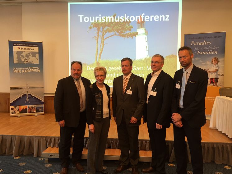 Sylvia Bretschneide, Präsidentin des Landtages und des Tourismusverbandes Mecklenburg Vorpommern e. V. - Morten Haure-Petersen, Geschäftsführer der Scandlines Deutschland GmbH - Bernd Fischer, Geschäftsführer des Tourismusverbandes Mecklenburg-Vorpommern e. V - Matthias Dettmann, Hauptgeschäftsführer DEHOGA Mecklenburg-Vorpommern und Lars Ramme Nielsen, Director VisitDenmark Deutschland.
