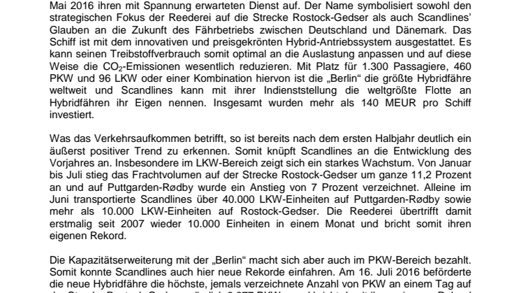 Die Kapazitätserweiterung mit der „Berlin“ macht sich aber auch im PKW-Bereich bezahlt. Somit konnte Scandlines auch hier neue Rekorde einfahren. Am 16. Juli 2016 beförderte die neue Hybridfähre die höchste, jemals verzeichnete Anzahl von PKW an einem Tag auf der Strecke Rostock-Gedser, nämlich 3.377 PKW – und bricht damit ihren eigenen Rekord von der Woche zuvor. Hier lag die Anzahl bei 3.077. Insgesamt kann für das erste Halbjahr ein Anstieg von 7,7 Prozent im PKW-Bereich auf Gedser-Rostock verzeichnet werden.