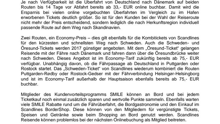 Zwei Routen, ein Economy-Preis – dies gilt ebenfalls für die Kombitickets von Scandlines für den kürzesten und schnellsten Weg nach Schweden. Auch die Schweden- und Öresund-Tickets werden 2017 günstiger angeboten. Mit dem „Öresund-Ticket" gelangen Reisende mit der Fähre nach Dänemark und fahren dann über die Öresundbrücke weiter nach Schweden. Dieses Angebot ist im Economy-Tarif zukünftig bereits ab 75,- EUR verfügbar. Unabhängig davon, ob die Fährpassage ab Deutschland in Puttgarden oder Rostock startet. Das „Schweden-Ticket" von Scandlines wiederum kombiniert die Routen Puttgarden-Rødby oder Rostock-Gedser mit der Fährverbindung Helsingør-Helsingborg und ist im Economy-Tarif außerhalb der Hauptsaison ebenfalls bereits ab 75,- EUR buchbar.