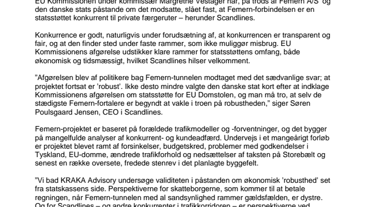 „Wir haben KRAKA Advisory gebeten, die finanzielle Stabilität der Planungen zur Festen Fehmarnbelt-Querung aus Sicht der Staatskasse zu untersuchen. Wie die Analyse zeigt, geht die Rechnung für das größte Infrastrukturprojekt der dänischen Geschichte nicht auf. Was für die dänischen Steuerzahler beängstigend sein sollte, ist für uns eine Frage unternehmerischer Zukunftsplanung“, sagt Søren Poulsgaard Jensen, CEO Scandlines, und ergänzt: