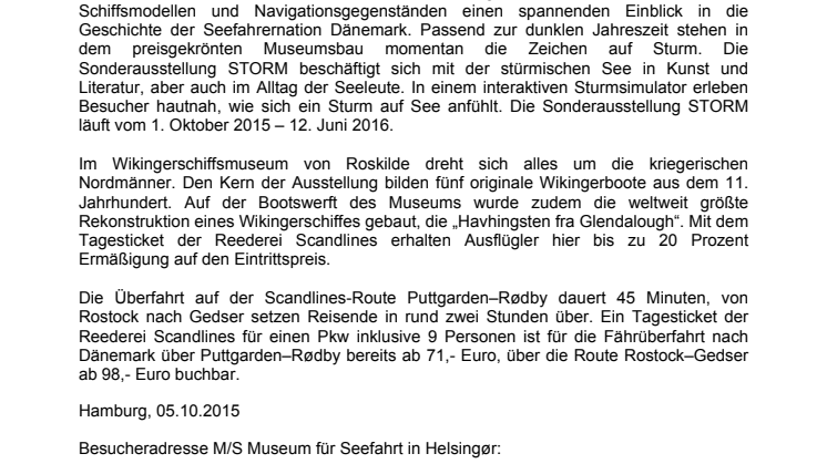 Auch in der dunklen Jahreszeit sorgt Scandlines für ein maritimes Dänemarkerlebnis der besonderen Art. Eine kurze Schifffahrt von Rostock und Puttgarden entfernt warten mit dem M/S Museum für Seefahrt in Helsingør und dem Wikingerschiffmuseum von Roskilde weltweit gefeierte Attraktionen auf große und kleine Besucher.
