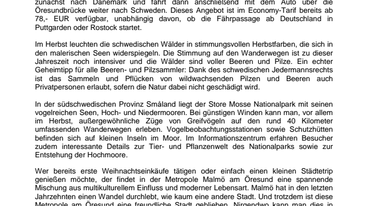 Auf der schwedischen Seite der Öresundregion lassen sich stimmungsvolle Herbstwanderungen und urbanes Großstadtflair ausgezeichnet kombinieren. Damit ist die Region ideal für alle Reisenden, die bei einem Kurztrip in den Herbstferien sowohl Erholung in den stimmungsvollen Herbstlandschaften der schwedischen Wälder suchen, als auch das Angebot einer Großstadt wie Malmö schätzen. Mit dem „Öresund-Ticket“ bringt Scandlines Reisende unkompliziert und schnell ans Ziel. Mit der Fähre gelangt man zunächst nach Dänemark und fährt dann anschließend mit dem Auto über die Öresundbrücke weiter nach Schweden. Dieses Angebot ist im Economy-Tarif bereits ab 78,- EUR verfügbar, unabhängig davon, ob die Fährpassage ab Deutschland in Puttgarden oder Rostock startet.