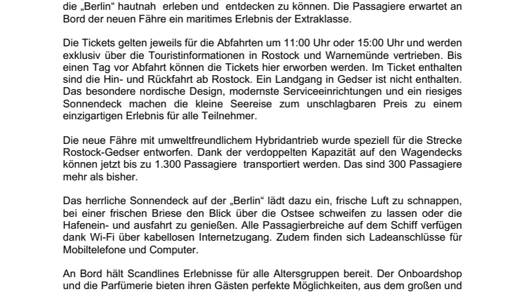 Das neue Fährschiff „Berlin“ der Reederei Scandlines nimmt den Regelbetrieb auf der Route Rostock-Gedser auf. Vom 30. Mai 2016 bis zum 22. Juni 2016 bietet die Reederei daher allen Rostockern und anderen Interessenten über 9.000 Jungfernfahrt-Tickets für Fußgänger zum Sonderpreis von 1 EUR pro Person an, um die „Berlin“ hautnah erleben und entdecken zu können. Die Passagiere erwartet an Bord der neuen Fähre ein maritimes Erlebnis der Extraklasse.