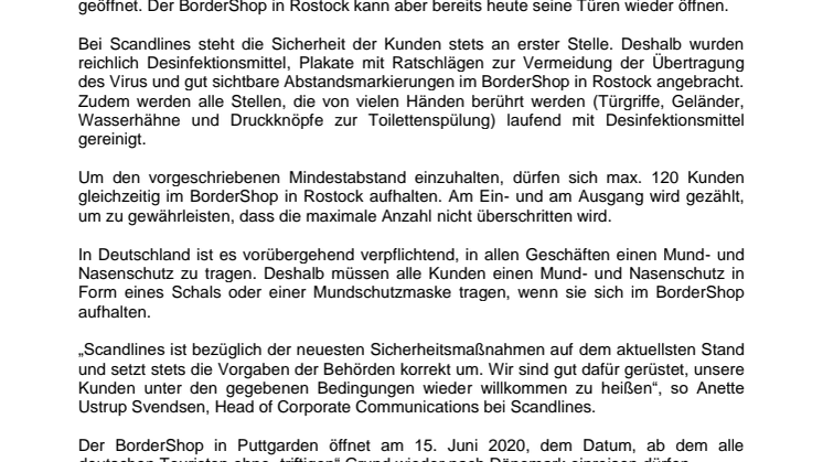 Seit der Grenzschließung Mitte März hat Scandlines den Betrieb aufrechterhalten, um Nahrungsmittel, Medikamente und andere lebenswichtige Waren zu transportieren. Ab dem 15. Juni wird die Grenze nach Dänemark auch wieder für Touristen aus Deutschland geöffnet. Der BorderShop in Rostock kann aber bereits heute seine Türen wieder öffnen.