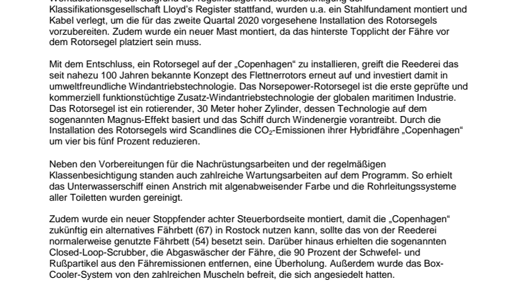 Mit dem Entschluss, ein Rotorsegel auf der „Copenhagen“ zu installieren, greift die Reederei das seit nahezu 100 Jahren bekannte Konzept des Flettnerrotors erneut auf und investiert damit in umweltfreundliche Windantriebstechnologie. Das Norsepower-Rotorsegel ist die erste geprüfte und kommerziell funktionstüchtige Zusatz-Windantriebstechnologie der globalen maritimen Industrie. Das Rotorsegel ist ein rotierender, 30 Meter hoher Zylinder, dessen Technologie auf dem sogenannten Magnus-Effekt basiert und das Schiff durch Windenergie vorantreibt. Durch die Installation des Rotorsegels wird Scandlines die CO2-Emissionen ihrer Hybridfähre „Copenhagen“ um vier bis fünf Prozent reduzieren.