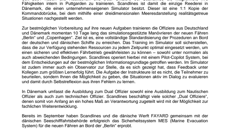 Zur bestmöglichen Vorbereitung auf ihre neuen Aufgaben trainieren die Offiziere aus Deutschland und Dänemark momentan 10 Tage lang das simulationsgestützte Manövrieren der neuen Fähren „Berlin“ und „Copenhagen“. Ziel ist es, eine vollständige Standardisierung der Prozeduren an Bord der deutschen und dänischen Schiffe zu erreichen. Das Training im Simulator soll sicherstellen, dass die zur Verfügung stehenden Ressourcen zu jedem Zeitpunkt optimal eingesetzt werden, um einen sicheren und effektiven Fährbetrieb gewährleisten zu können – sowohl unter normalen als auch abweichenden Bedingungen. Scandlines operiert hierbei mit einem Pilot-Copilot System, bei dem Entscheidungen auf der bestmöglichen Informationsgrundlage getroffen werden. Im Simulator ist zudem immer auch ein Observator zur Stelle, da es sich gezeigt hat, dass Feedback unter Kollegen zum größten Lernerfolg führt. Die Aufgabe der Instrukteure ist es nicht, die Teilnehmer zu beurteilen, sondern Ihnen die Möglichkeit zu geben, die Situationen aktiv im Dialog zu evaluieren und damit durch Selbstreflexion aus ihren Fehlern zu lernen.