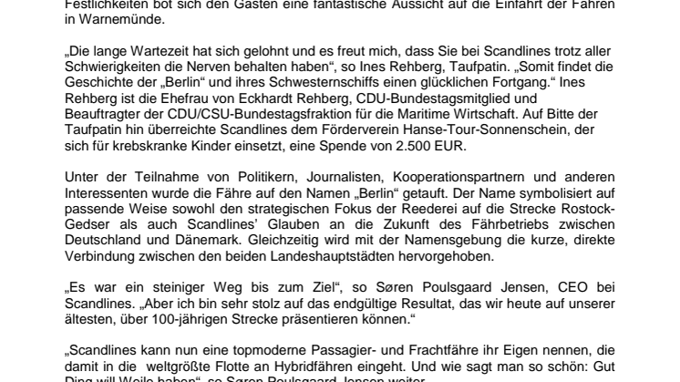„Die lange Wartezeit hat sich gelohnt und es freut mich, dass Sie bei Scandlines trotz aller Schwierigkeiten die Nerven behalten haben“, so Ines Rehberg, Taufpatin. „Somit findet die Geschichte der „Berlin“ und ihres Schwesternschiffs einen glücklichen Fortgang.“ Ines Rehberg ist die Ehefrau von Eckhardt Rehberg, CDU-Bundestagsmitglied und Beauftragter der CDU/CSU-Bundestagsfraktion für die Maritime Wirtschaft. Auf Bitte der Taufpatin hin überreichte Scandlines dem Förderverein Hanse-Tour-Sonnenschein, der sich für krebskranke Kinder einsetzt, eine Spende von 2.500 EUR.