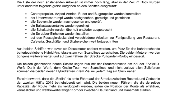 Es wird erwartet, dass die „Berlin“ als erste Fähre auf der Strecke zwischen Rostock und Gedser in der zweiten Hälfte 2015 betriebsbereit sein wird. Die beiden neuen Fähren, die die derzeitige Kapazität der Route mehr als verdoppeln werden, sollen die Position der Route als effektiver, verlässlicher und wettbewerbsfähiger Korridor zwischen Deutschland und Dänemark stärken.
