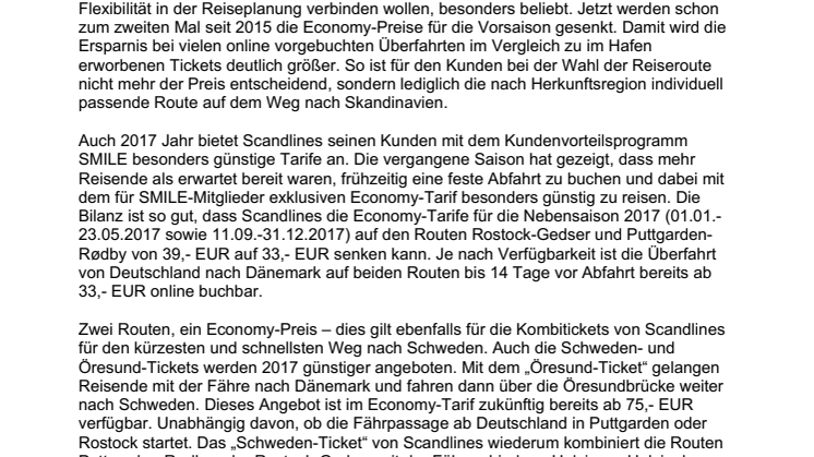 Auch 2017 Jahr bietet Scandlines seinen Kunden mit dem Kundenvorteilsprogramm SMILE besonders günstige Tarife an. Die vergangene Saison hat gezeigt, dass mehr Reisende als erwartet bereit waren, frühzeitig eine feste Abfahrt zu buchen und dabei mit dem für SMILE-Mitglieder exklusiven Economy-Tarif besonders günstig zu reisen. Die Bilanz ist so gut, dass Scandlines die Economy-Tarife für die Nebensaison 2017 (01.01.- 23.05.2017 sowie 11.09.-31.12.2017) auf den Routen Rostock-Gedser und Puttgarden-Rødby von 39,- EUR auf 33,- EUR senken kann. Je nach Verfügbarkeit ist die Überfahrt von Deutschland nach Dänemark auf beiden Routen bis 14 Tage vor Abfahrt bereits ab 33,- EUR online buchbar.