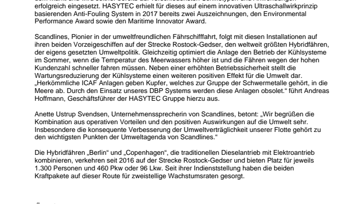 Scandlines, Pionier in der umweltfreundlichen Fährschifffahrt, folgt mit diesen Installationen auf ihren beiden Vorzeigeschiffen auf der Strecke Rostock-Gedser, den weltweit größten Hybridfähren, der eigens gesetzten Umweltpolitik. Gleichzeitig optimiert die Anlage den Betrieb der Kühlsysteme im Sommer, wenn die Temperatur des Meerwassers höher ist und die Fähren wegen der hohen Kundenzahl schneller fahren müssen. Neben einer erhöhten Betriebssicherheit stellt die Wartungsreduzierung der Kühlsysteme einen weiteren positiven Effekt für die Umwelt dar. „Herkömmliche ICAF Anlagen geben Kupfer, welches zur Gruppe der Schwermetalle gehört, in die Meere ab. Durch den Einsatz unseres DBP Systems werden diese Anlagen obsolet.“ führt Andreas Hoffmann, Geschäftsführer der HASYTEC Gruppe hierzu aus.