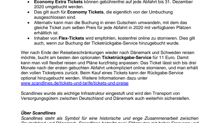 Wer nach Ende der Reisebeschränkungen wieder nach Dänemark und Schweden reisen möchte, bucht am besten den optionalen Ticketrückgabe-Service für 11 Euro. Damit kann man voll flexibel reisen und Pläne kurzfristig anpassen: Das Ticket lässt sich bis drei Monate nach der ersten gebuchten Abfahrt unkompliziert online stornieren, und man erhält den vollen Ticketpreis zurück. Beim Kauf eines Tickets kann der Rückgabe-Service optional hinzugebucht werden. Weitere Informationen dazu unter www.scandlines.de/tickets-und-tarife/tickets-und-preise