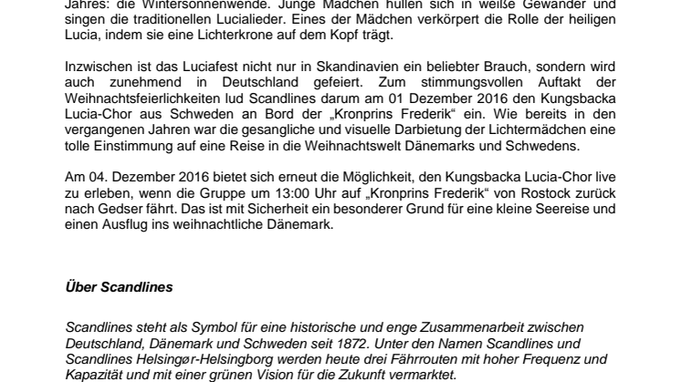 Inzwischen ist das Luciafest nicht nur in Skandinavien ein beliebter Brauch, sondern wird auch zunehmend in Deutschland gefeiert. Zum stimmungsvollen Auftakt der Weihnachtsfeierlichkeiten lud Scandlines darum am 01 Dezember 2016 den Kungsbacka Lucia-Chor aus Schweden an Bord der „Kronprins Frederik“ ein. Wie bereits in den vergangenen Jahren war die gesangliche und visuelle Darbietung der Lichtermädchen eine tolle Einstimmung auf eine Reise in die Weihnachtswelt Dänemarks und Schwedens.