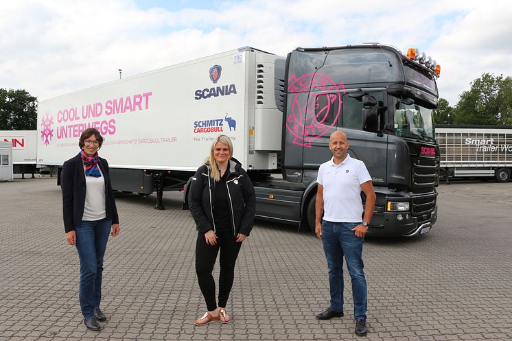 Christina Scheib, Mitte, nimmt Kühlauflieger bei Schmitz Cargobul in Empfang