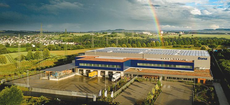 Die 9.200 Quadratmeter große Halle mit einer Lagerkapazität von rund 10.000 Europaletten ist das Herzstück der Logistik von Bona im Limburg. Die leistungsstarke Photovoltaikanlage (616 kWp) auf dem Dach sorgt für einen nachhaltigen Betrieb.