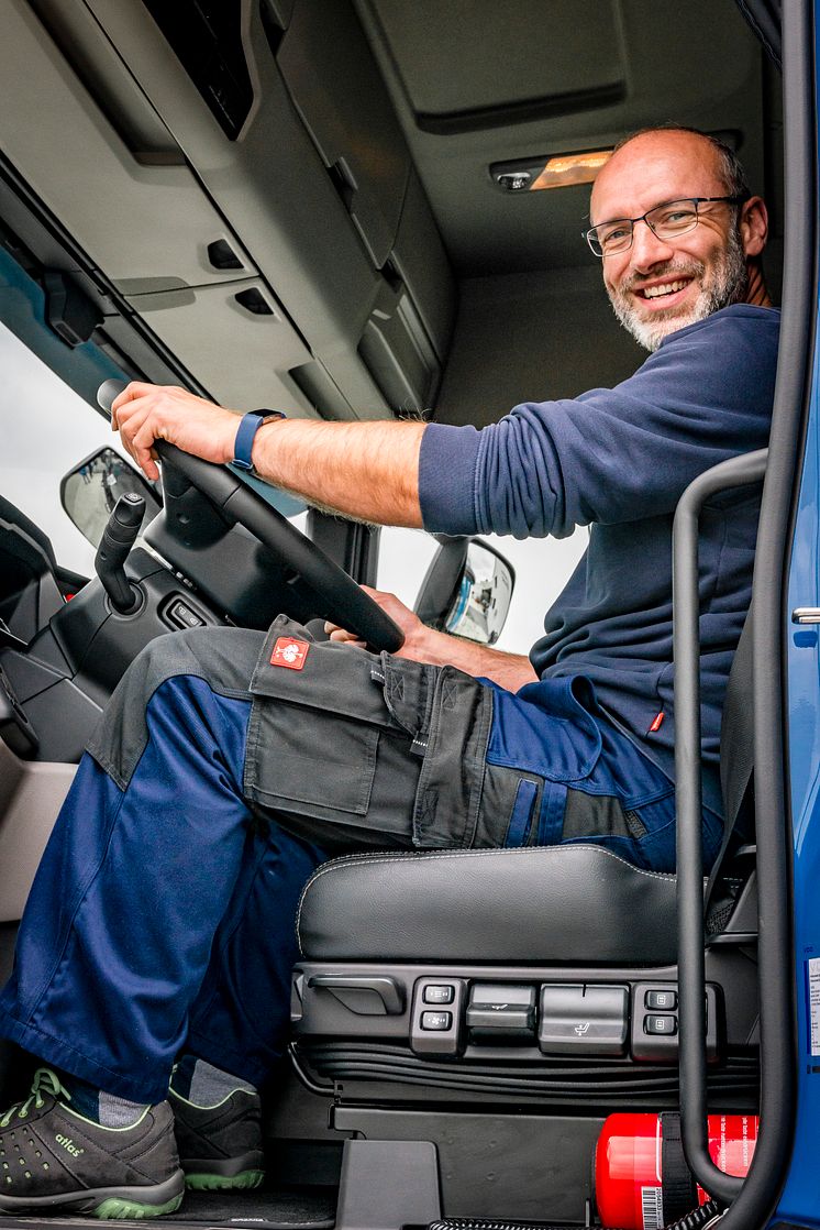 Lkw-Fahrer Thomas Schmieder im Fahrerhaus des Scania R 450 Oberleitungs-Lkw