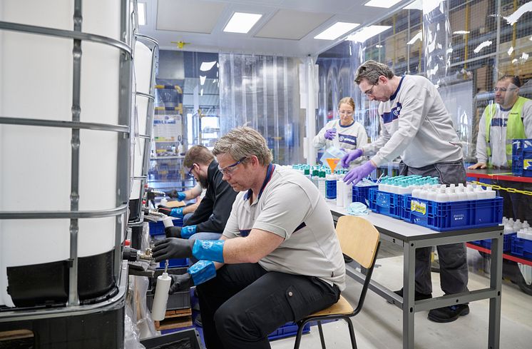 Scania Mitarbeiter füllen das Desinfektionsmittel um