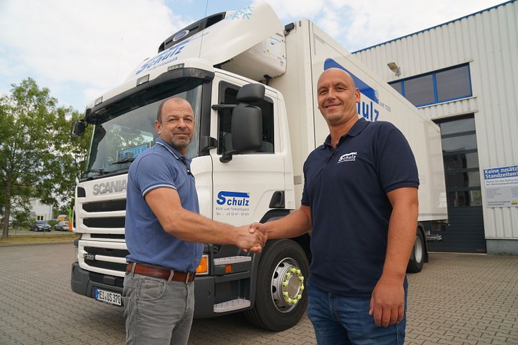 Andreas Kürbis, Scania Dresden, und Uwe Schulz (li.) verbindet eine vertrauensvolle Geschäftsbeziehung.