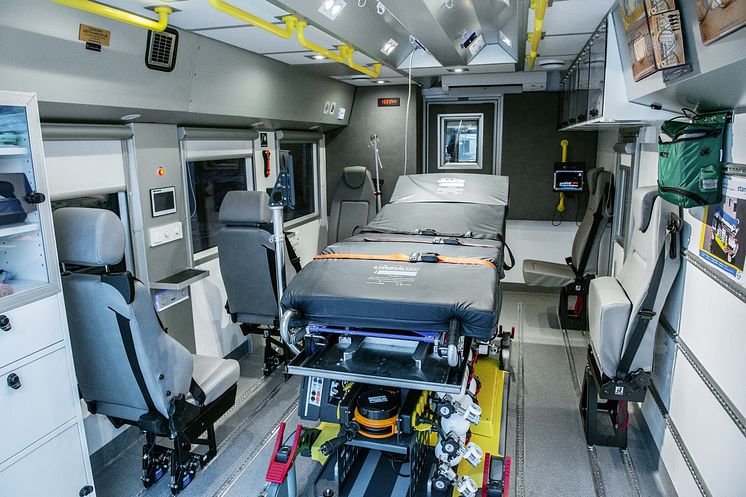 Der neue Intensivpflege Krankenwagen ist auf einem R-Fahrgestell von Scania aufgebaut und als Bus zugelassen, da er mehr als neun Sitzplätze bereitstellt. „Aber, wenn es um das reine Fahrgefühl geht, glaubt man, in einem Pkw zu sitzen“, sagt Christian Strand. Die Entwicklung des Fahrzeugs hat etwa drei Jahre in Anspruch genommen. Strand ergänzt: „Der Sicherheitsfaktor war uns bei dem Krankenwagen sehr wichtig. Darum haben wir uns auch für Scania entschieden.“ Das Fahrzeug ist mit einem Scania Notbremsassistenten, sowie mit Radar, 360° Kamera und Scania Spurhalteassistent ausgestattet.